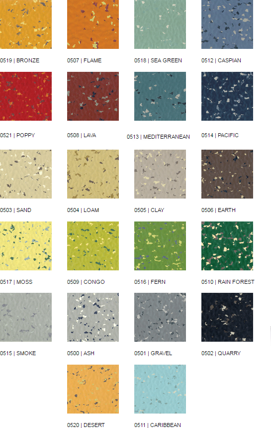 Piso de goma para tránsito muy intenso, con superficie martillada y atractivo diseño con chips de colores contrastantes.